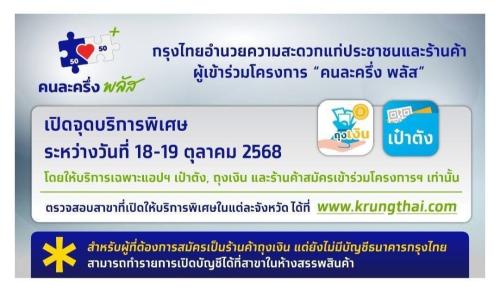 "ธนาคารกรุงไทย" อำนวยความสะดวกแก่ประชาชนและร้านค้า ผู้เข้าร่วมโครงการ "คนละครึ่ง พลัส" เปิดจุดบริการพิเศษ ระหว่างวันที่ 18-19 ตุลาคม 2568 โดยให้บริการเฉพาะแอปฯ เป๋าตัง, ถุงเงิน และร้านค้าสมัครเข้าร่วมโครงการฯ เท่านั้น