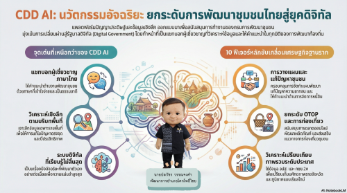 กรมการพัฒนาชุมชนเปิดตัว “CDD AI” ผู้ช่วยพัฒนากรอัจฉริยะ ที่รวบรวมข้อมูล Big Data และ AI ไว้ในแพลตฟอร์มเดียว เพื่อช่วยให้นักพัฒนาชุมชน ผู้บริหาร และประชาชน เข้าถึงข้อมูล วิเคราะห์ปัญหา และวางแผนพัฒนาชุมชนได้อย่างแม่นยำ รวดเร็ว และตรงจุด